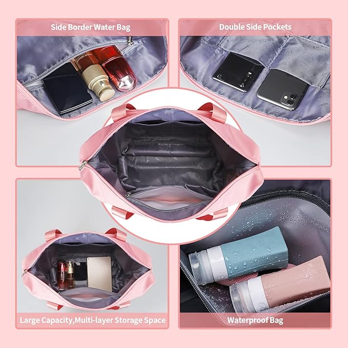 Expandable Travel Duffel Tote Bag - Foldable Overnight Weekender, Carry-On, Swim & Gym Bag - Fits Spirit Airlines Personal Item Size - Lightweight, Waterproof & Durable with Trolley Sleeve, Light Pink