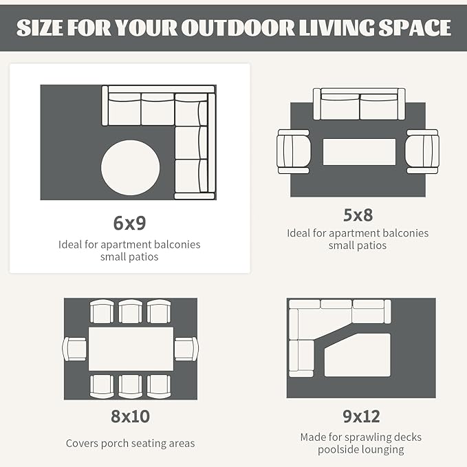 - Waterproof & Easy Cleaning: The outdoor/indoor rugs are water proof and easy to clean. Our rugs resist lots of stains: milk, wine, cola, grass and more. Simply sweep away dirt with water and the breathable design make it possible to airing dry in few minutes. If you are outside without water, you can just wipe it with cleaning cloth or shake it, rid the dust off. Great for keeping dogs out of the dirt.