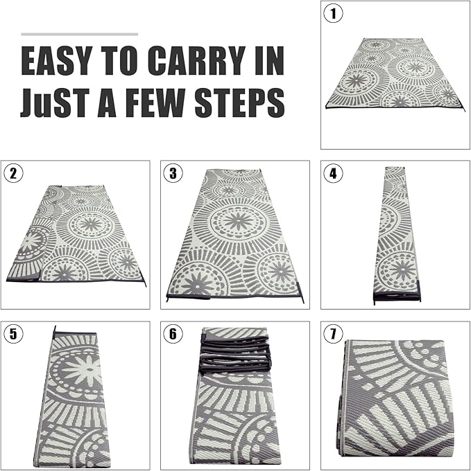 - Portable & Foldable: To meet the needs of outdoor activities, our outdoor camping rugs are light weight. And the reversible rugs are added seams for easily folding. Apart from that, every rug has 13 stakes for pressing rug on ground which make sure your rugs keep stable in windy day.And it comes with a carrying bag for added convenience. Durable Oxford cloth storage bag, and the transparent design on one side can show the beautiful color of the rugs.