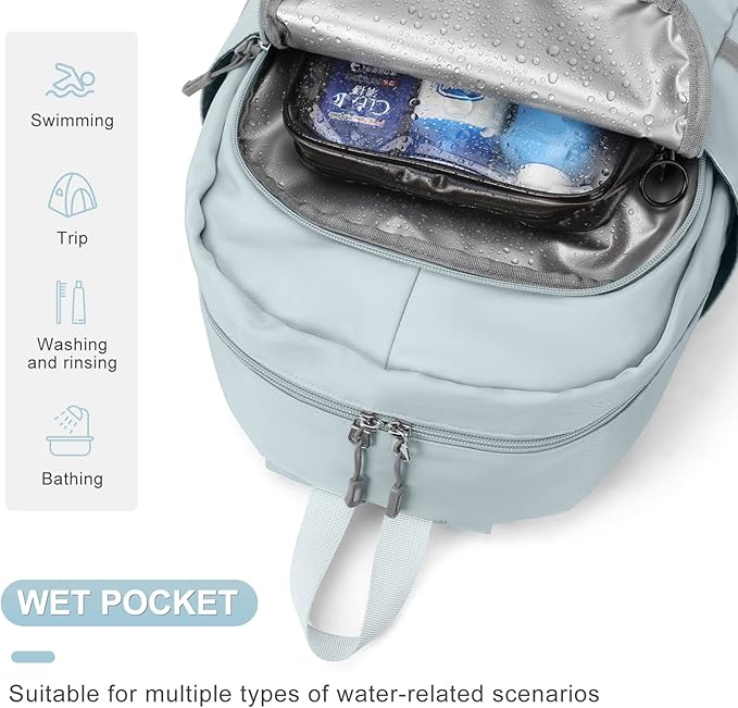 - ★WET POCKET★: The wet pocket can hold wet items, such as toiletries, towels, swimming suits, etc., which is convenient for you to use when you are on a business trip or shower after exercise, and avoids getting wet in other parts of the backpack.