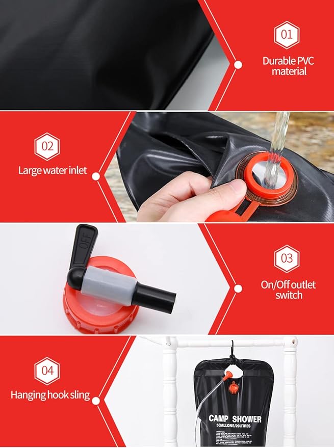 - 【Heat Absorption Design】- Under direct sunlight, the camping shower bag can heat water to 105°F (40°C) in just 3 hours. No need for gas or electricity to enjoy a warm shower outdoors!