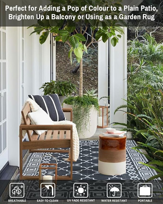 - REVERSIBLE OUTDOOR MAT - Our outdoor rugs are woven from 100% plastic straw and they are tightly woven with strong and hard wearing for a comfortable feeling underfoot.These rugs are reversible, double weave, allowing you to have two different looks in a matter of seconds,Its lightweight construct and low static electricity make this a perfect choice for any patio decor