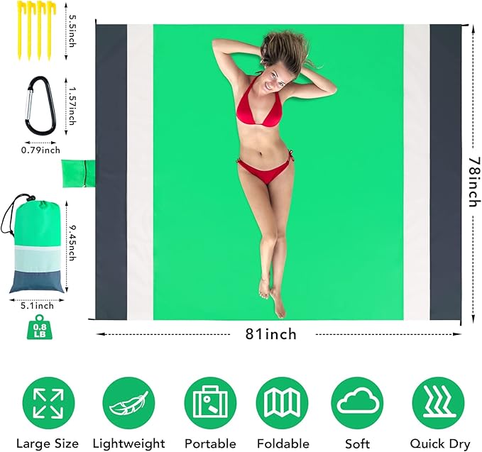 - 【Oversized & Windproof】The beach blanket was measured by 78''×82'’ which perfectly fits 4-7 adults. It’s equipped with 4 fixed anchors, you never need to worry about the beach mat being blown by the wind on the beach at all. It won't affect you lying on the beach blanket and basking in the sun at all, it's really your beach essentials!