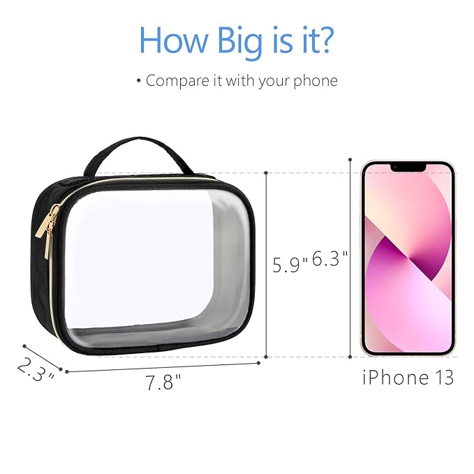 - TSA Approved: This 7.8 x 2.3 x 5.9 inch clear makeup bag follows the 3-1-1 Liquid Rule of airlines. When placing travel-sized containers that are 3.4 ounces or 100 milliliters in this quart-sized bag, you can quickly pass the airport security screening