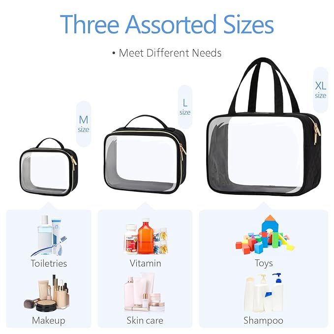 - Portable & Reusable: 3 packages can meet your different needs when traveling or going out, store travel bottles, toothpaste, shampoo, and mouthwash lotion. Tips to remove the smell: Please first wash the outside and inside of the makeup bag with soap and water, then unzip the bag and leave it in a well-ventilated place for a few days