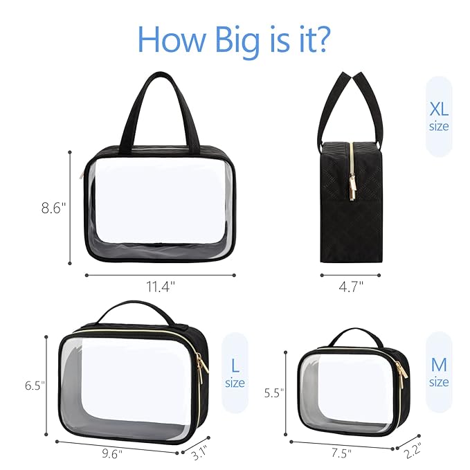 - Travel Essentials: The medium size clear makeup bag is 7.8 x 2.3 x 5.9 inch, the large size toiletry bag is 9.8 x 3.1 x 6.6 ihch, the x-large size travel bag is 11.4 x 4.7 x 8.6 inch. Note: only the medium size cosmetic bag is TSA approved
