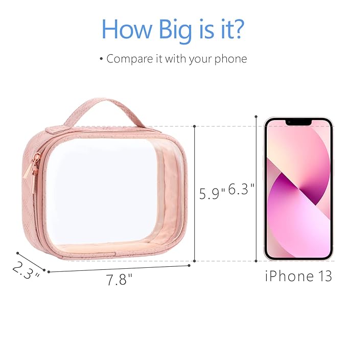 - TSA Approved: This 7.8 x 2.3 x 5.9 inch clear makeup bag follows the 3-1-1 Liquid Rule of airlines. When placing travel-sized containers that are 3.4 ounces or 100 milliliters in this quart-sized bag, you can quickly pass the airport security screening