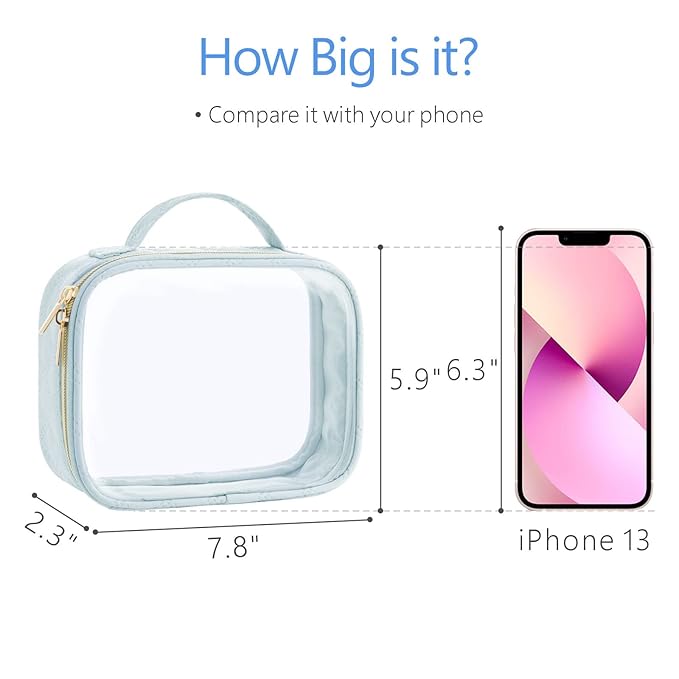 - TSA Approved, Meet Liquids Rule: The medium size clear makeup bag is 7.8 x 2.3 x 5.9 inch, it follows the TSA's 3-1-1 Liquid Rule published by TSA. You can quickly pass the airport security screening