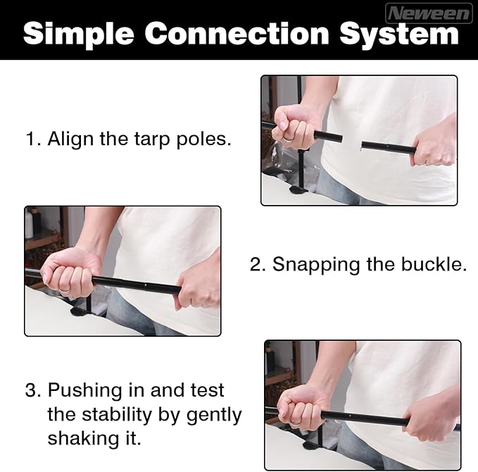 - EASY TO INSTALL -- Quick and easy to install, simply align the holes, snap the buckle onto the tarp pole, and then push it into the hole. No need to worry about the pole bending