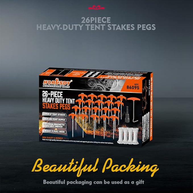 HORUSDY 26 Pack 8.07 Inch Heavy Duty Tent Stakes Tent Pegs Camping Stakes with with 4x13ft Rope & 1 Stopper T Pull Hook