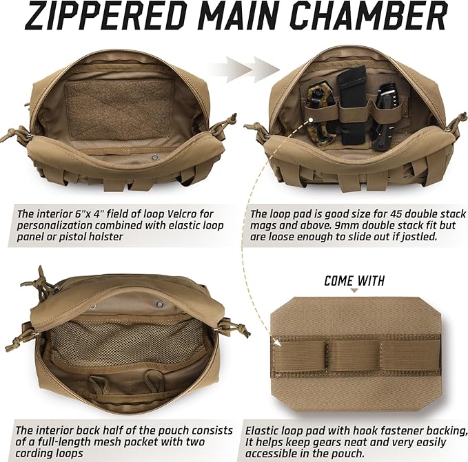 - ACCESSORIES INSERT INCLUDED: Molle GP Pouch is lined with LOOP panel inside for inserting suite, convenient for users to DIY like the mesh pocket insert, elastic loop organizer, zipper pocket insert, etc. Our GP pouch comes with a modular organizer insert with three sections elastic loop.
