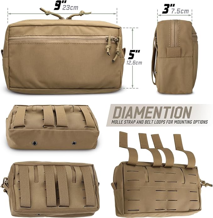 - WEAR-RESISTANT: General Purpose Pouch is constructed of durable 500D Nylon Fabric, with the property of durability, water resistance and tear-resistant, preventing the material from fraying over time with rugged use. Size: 9"L x 5"H x 3"D / 23 * 12.6 * 7.5cm