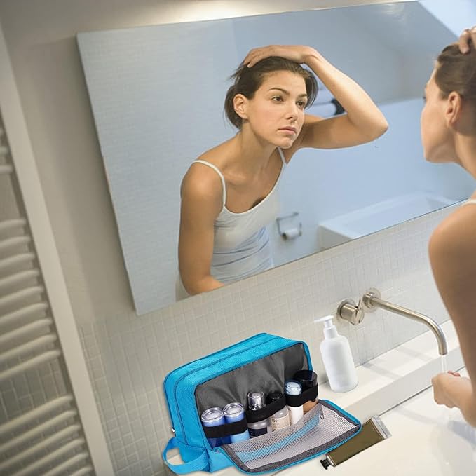 - 【ORGANIZED COMPARTMENTS】 --- Main compartment that holds larger items such as shampoo bottles or shaving cream. One zippered mesh pouch that keeps your smaller toiletries and cosmetics in a place visible and breathable. Other side front zipper pocket that provides extra storage with easy.