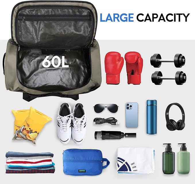- Large Capacity Duffle Bag: Large main compartment provides plenty of room to hold your sports gear and traveling necessities, 1 large mesh zipper pocket under flap to keep light things and easy access, 1 small zipper pocket and 2 side zipper pockets to organize your small items, Haimont duffel bag backpack is available in 40L, 60L and 90L