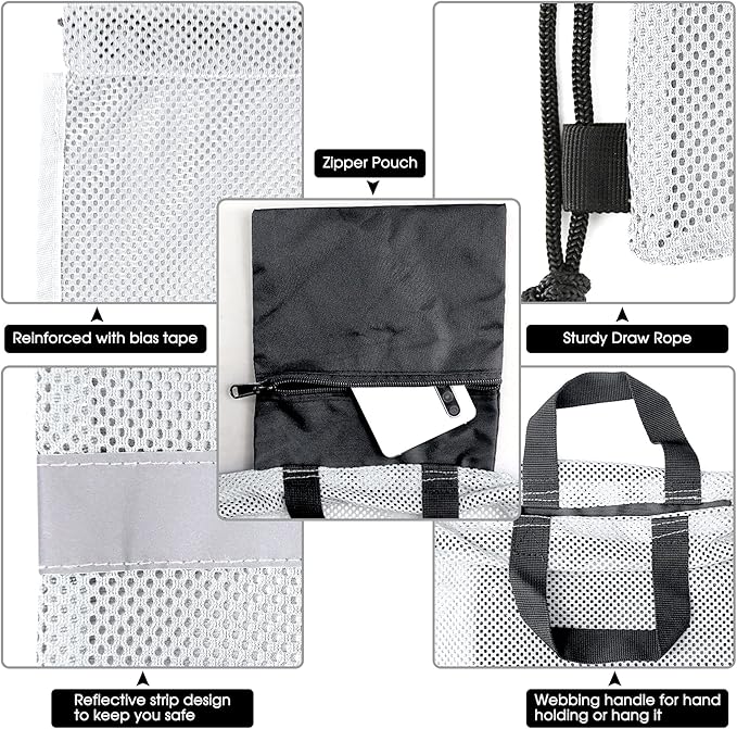 - Inner Zipper Pocket & Reflective Strip: Our mesh drawstring bag has a zipper pocket. The pocket (6.7'' x 7") of our drawstring backpack can put your value items, like phones, keys, wallets, etc, and add the utility rate of space. Our string backpack bag extra adds a reflective strip, which enhances the high visibility in dark or dusk. Greatly reduce your chance of being hit.