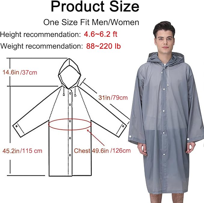 - 【PERFECT FITS MOST】Our rain poncho with long sleeves, quality button and big hood drawstring design can be better resist rain and windproof. Chest: 49.6 in, cloth length: 59.8 in, sleeve length: 31 in, great length on the sleeves and down the legs. Emergency waterproof ponchos for outdoors, one size fits men and women with 4.6~6.2 ft height.