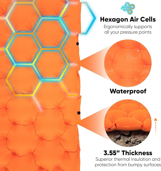 • REJUVENATE YOUR BODY: Powerlix upgraded camping pad has revolutionary design made with body mapping technology. The hexagon air cells ergonomically support all of your pressure points, giving you superior support and comfort all night long, no matter how you sleep! The sleeping mat is also a camping gear must haves luxury, being comfortable yet lightweight. It rolls up small, making it effortless to carry around. It is sure to match anyone's personality.