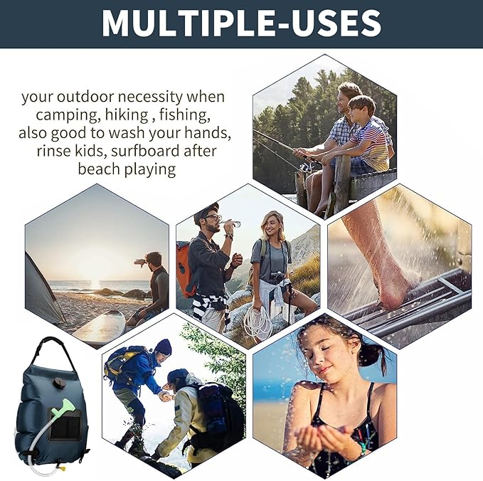 - 【WIDE RANGE OF USES】 - This solar shower bag 5 gallon camping shower bag is suitable for outdoor activities such as camping,backpacking,hiking,fishing or hunting,our portable shower bag is one of the indispensable outdoor equipment accessories for you and your family.