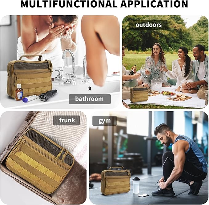 - Multi-Functional Hanging Toiletry Bag for Men - Built-In 360° Rotating Hook for Bathroom/Campsite Use + Front MOLLE Panel Compatible with Carabiners & Accessories, Back Zipper Pocket Secures Valuables.