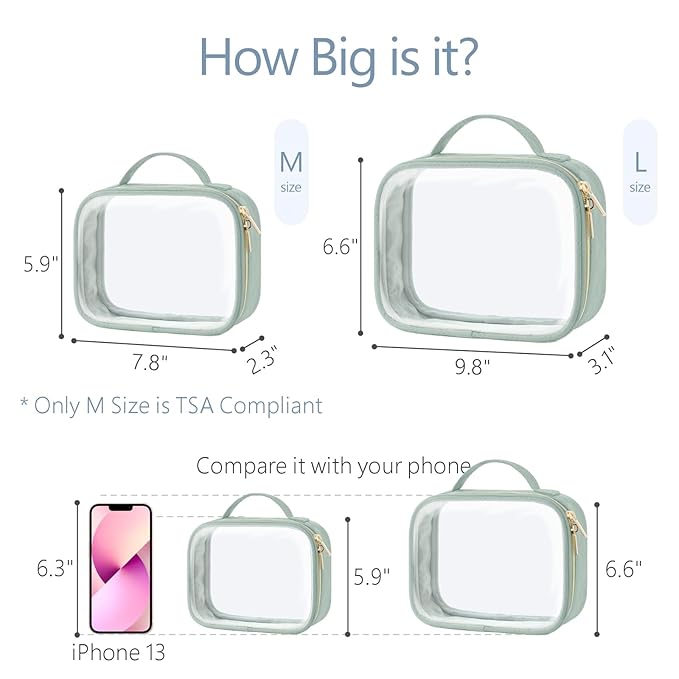 - TSA-approved & hassle-free security checks: This medium clear makeup bag measures 7.8 x 2.3 x 5.9 inches, perfectly complying with TSA’s 3-1-1 liquids rule and breeze through airport security without unpacking; note the large size clear bags for travel (9.8 x 3.1 x 6.6 inches) exceeds one quart and isn’t TSA-approved