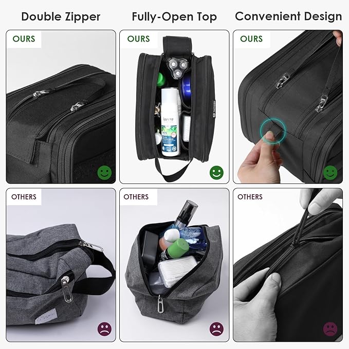 - Dual Zipper & Practical Handle: Double zippers let you grab what you need in seconds—no more digging through a single-zipper bag; Side handle makes toiletries bag easy to carry or hang in your hotel bathroom; Ideal for rushed mornings or late-night arrivals
