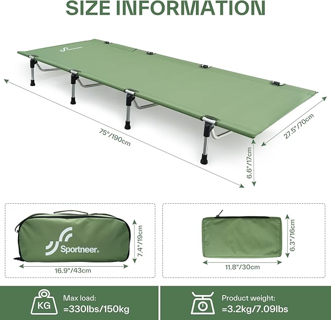 - More Sturdy & Steady: Enjoy the pinnacle of quality and comfort the Sportneer camp folding cot. The portable backpacking cot legs boast exceptional aerospace-grade 7075 aluminum alloy while the lightweight sleeping bed surface is expertly constructed tear-resistant 300D elastic polyester fabric, reinforced PU coating. This winning combination ensures unparalleled stability and durability, supporting a maximum weight of 330 pounds.