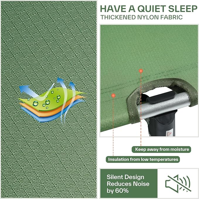 - Silence in Use: Experience a peaceful night's sleep the 74.8x27.6-inch Sportneer camping cot. Its inner mesh fabric backpacking bed surface reduces noises caused by turning over, ensuring a quiet and comfortable slumber. the ample space and whisper-quiet design, you can rest easy wherever your adventures take you.