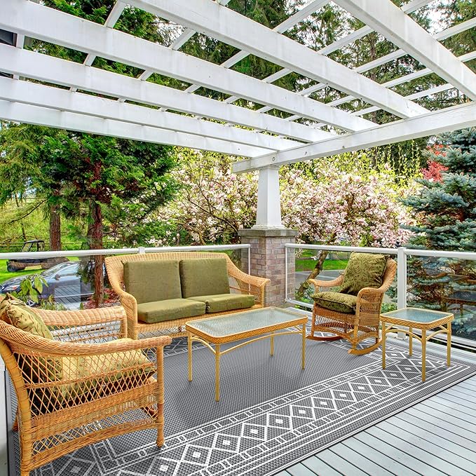 GENIMO Outdoor Rug Waterproof for Patio Decor, 5'x8' Reversible Plastic Straw Area Carpet, Camping Outside Mat for Outdoor, RV, Deck, Camper, Balcony,Picnic Grey & White