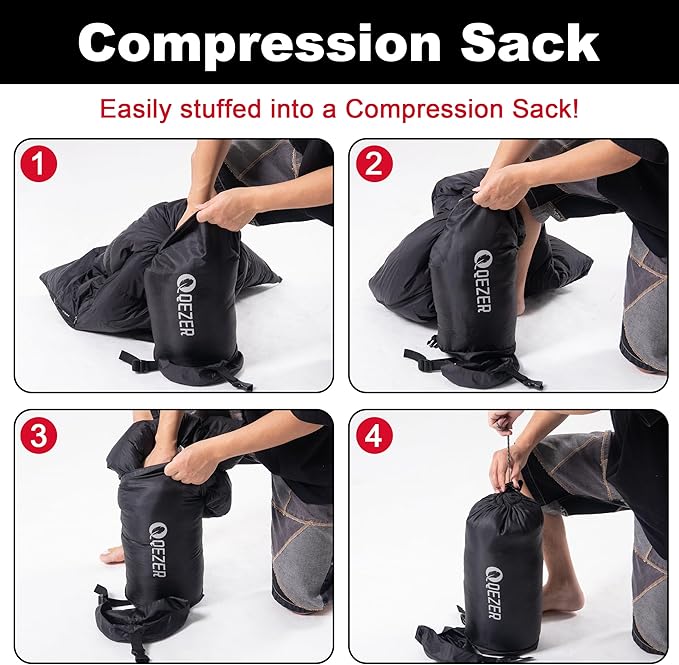 - 【This is QEZER's newly updated sleeping bag】The upgraded adult backpacking sleeping bag has larger and wide space, better wrapping and warmth retention. There is a windshield design at the zipper to block air convection and prevent heat loss. The foot is an ergonomic foot box design, which ensures a more reasonable space for the feet to obtain the best warmth and comfort. The inner and outer 400T20D nylon fabric ensures you will stay comfortable in wet conditions.