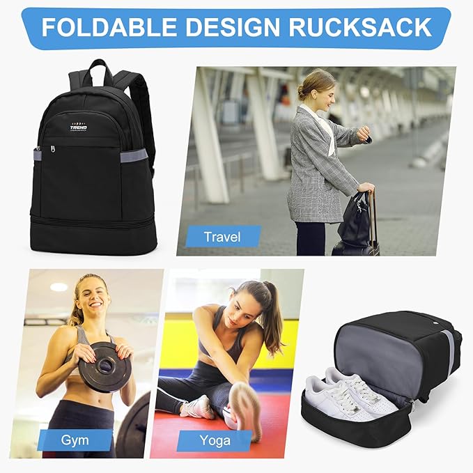- 【FOLDABLE DESIGN FOR EASY STORAGE】When not in use, this backpack can be folded into small items for easy storage and takes up very little space. How to do it: Open the bottom zipper, turn the independent shoe bag upside down, put the backpack upside down, and zip it up after you’re done.