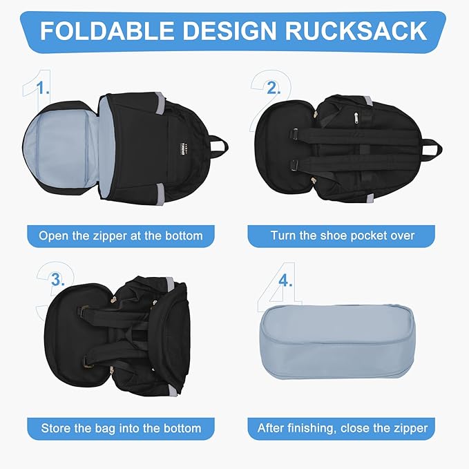 - 【MULTIPURPOSE SPACE STORAGE】About 20L of storage space. The main spacious compartment can hold 3-5 thin tops or pants, the 3 mesh insert pockets can be used to store iPad, wallets or power banks. The inner zip pocket can be used to store ID and credit cards. There are also two side pockets that can store water bottles and umbrellas.