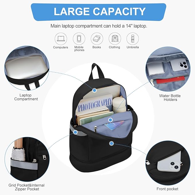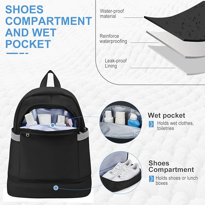 - 【WET POCKET】The wet pocket can hold wet items, such as toiletries, towels, swimming suits, etc., which is convenient for you to use when you are on a business trip or shower after exercise, and avoids getting wet in other parts of the backpack.There's also a front pocket for small items like tissues and headphones for easy access.