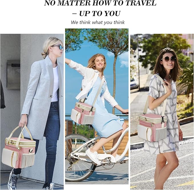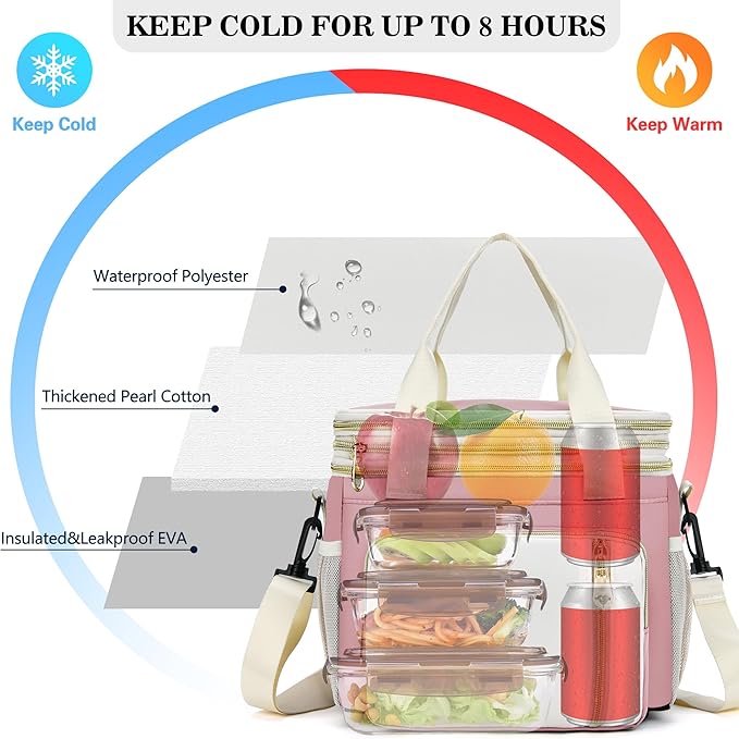 Lunch Box & Lunch Bag for Women, Large Insulated Adult Lunch Box Leakproof Lunchbox Cooler Bag for Work Picnic Beach,16L, Light Pink & White