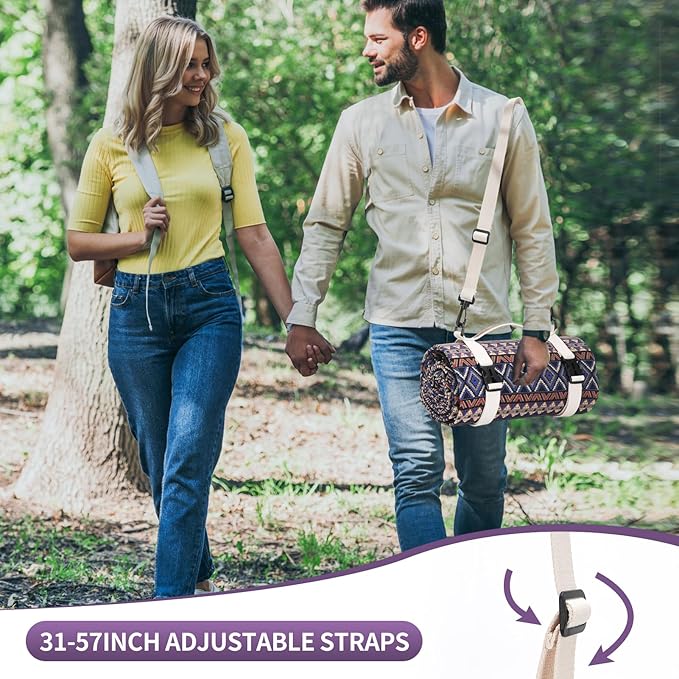 - ADJUSTABLE SHOULDER STRAPS - The portable picnic blanket can be carried easily by hand, on either shoulder by adjusting to the proper lengths, so you can carry other picnic suppliers with the other hand,the handle strap with double ring buckle is convenient to carry, and can easily fold and fix the picnic mat,so if you don't fold it exactly as originally packed, it will fit anyway,saving a lot of space on the travel.