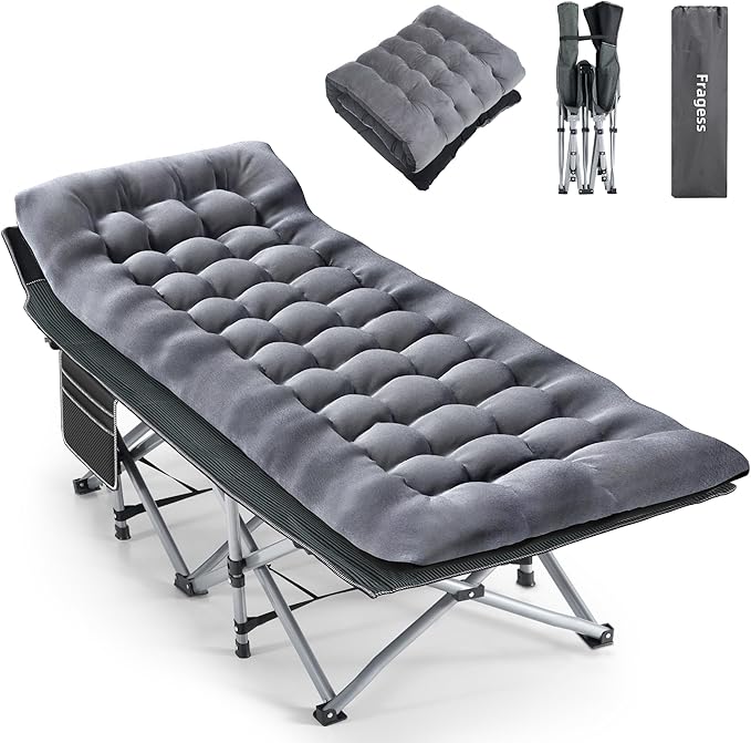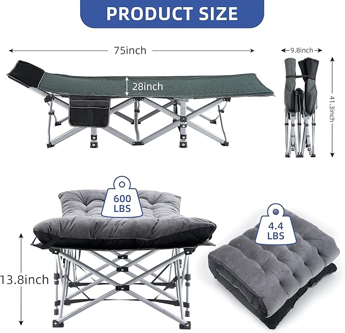- Camping Cots for Adults: Fragess heavy duty camping cot is made of 1-inch thick carbon steel, and each foot support are equipped with anti-slip pads to ensure safety and stability. 600 lbs heavy duty weight capacity and 75"*28"*13.8" size is ideal sleeping cots for adults