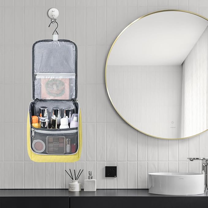 Travel Hanging Toiletry bag for Men & Women, Water-resistant Sturdy Nylon Toiletries Organizer for Cosmetics, Makeup Brushes, Shaving Tools, Bathroom Bag, Yellow