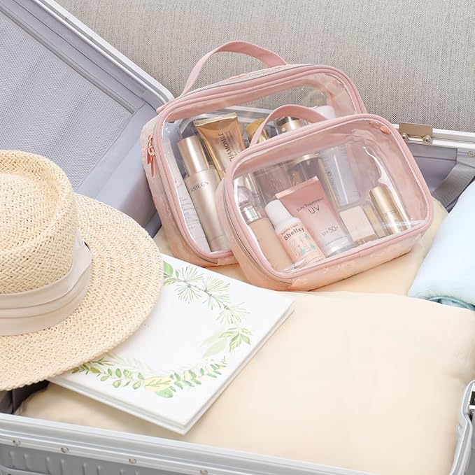 PACKISM Floral Texture Lace TSA Approved Toiletry Bag - 180° Large Opening Clear Makeup Bags in 2 Size, Clear Bags for Travel with Handle, 0.5 mm Thick Non-deformable No Smell, Pink