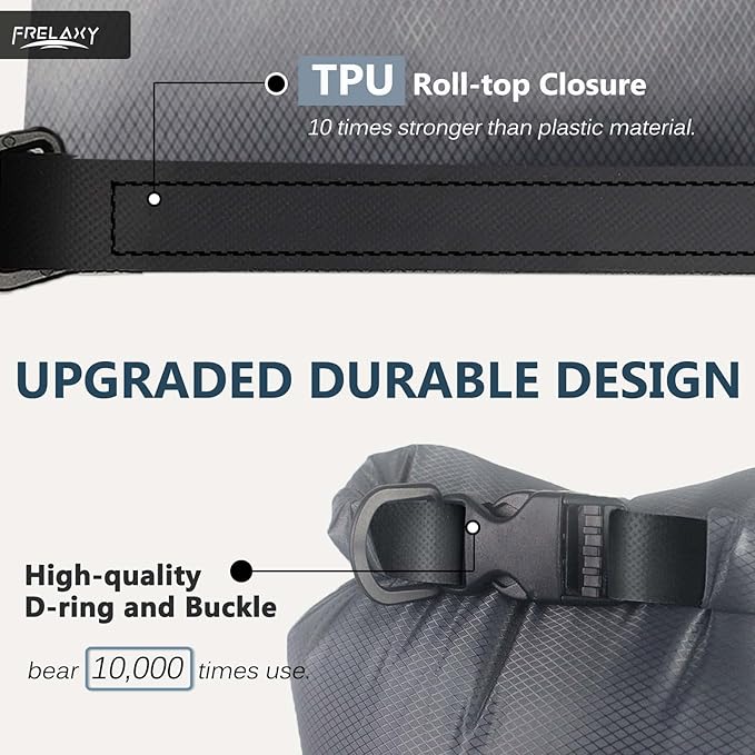 - UPGRADED DURABLE DESIGN: The dry bag is made of diamond ripstop polyester, and the roll-top closure is made of strong TPU material 10 times stronger than plastic. The sturdy D-ring and buckle can withstand up to 10,000 uses and are easy to attach to your backpack.