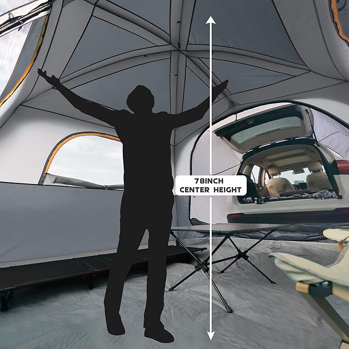- Roomy 6 People SUV Tent: Accommodate the whole family with our spacious tent that comfortably fits 6 people, measuring 10' x 9' x 78" (H) with enough room for 2 air mattresses or 6 sleeping bags, and a center height of 78" for easy standing and changing