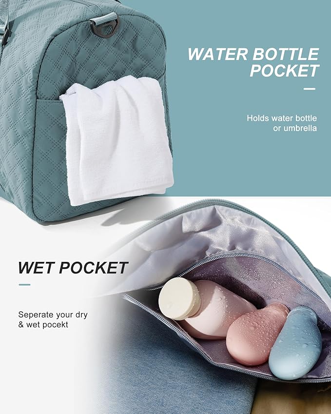- Dry/Wet Separated & Separate Shoe Compartment: This women's workout bag comes with a separate wet pocket, high-density waterproof material can help you separate wet and dry items, perfect for storing wet clothes, towels, umbrellas and toiletries, keep your sport bag organized and clean. The sports gym bag comes with a zippered shoe compartment that fits most shoe sizes to keep sweaty clothes or shoes away from the rest of your gear and vents to keep the bag ventilated and eliminate odors. A water bottle fits on the other side of the pocket to keep you hydrated after exercise