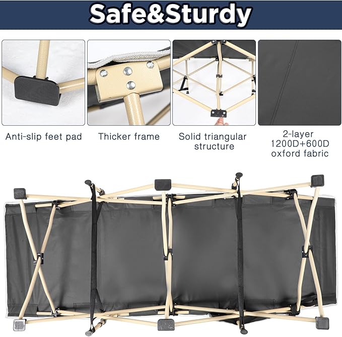 - Quality Material and Durable Construction: experience strength and durability with our folding camping cot, designed with a reliable steel tube bracket and a triangular structure; Crafted from 1200D and 600D oxford fabric, it is sturdy yet weighs only 13.2 lbs; Its robust steel frame can support a maximum capacity of up to 450 lbs, safe and reliable for adults