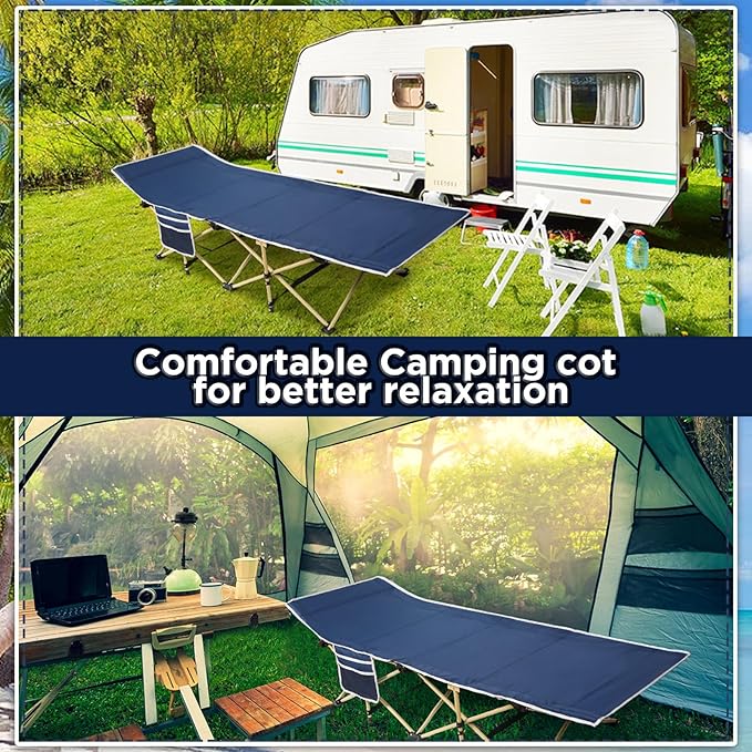 - Multi Functional Design: the navy blue sleeping cots for adults are ideal for various outdoor activities such as night hikes, backpacking, hunting, road trips, and more; However, the cot's versatility goes far more than the outdoors; It is also suited for indoor use and office nap times, offering ample space for maximum comfort