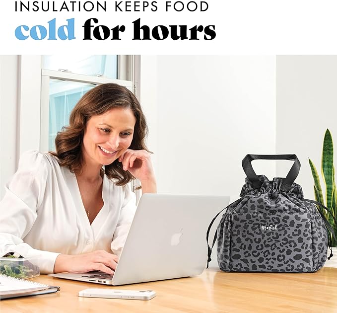 Fit & Fresh Lunch Bag For Women, Insulated Womens Lunch Bag For Work, Stain-Resistant Large Lunch Box For Women With Containers, Cinch Closure Cromwell Bag, Black Cheetah