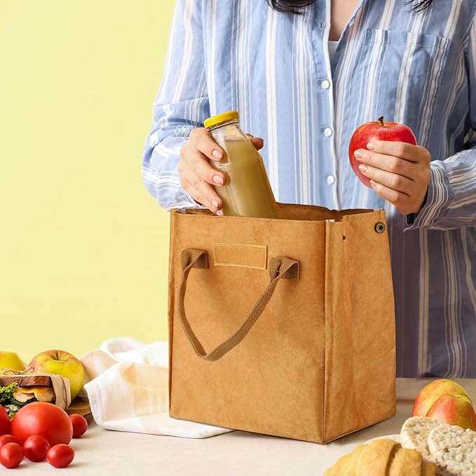 - Safe Material and Design Innovation: this reusable thermal lunch bag is crafted from robust high density polyethylene fiber; This smartly constructed bag is brown, subtly exuding an understated elegance; It provides not only an aesthetic appeal but is also well durable, further enhancing its longevity and trustworthiness