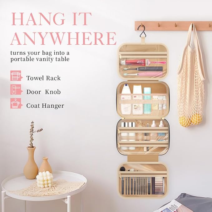 - STURDY HOOK DESIGN: Featuring a premium metal hook, the HOTOR cosmetic travel bag offers the convenience of hanging from a towel rack, coat hook, or any available space. This not only showcases your toiletries and cosmetics for easy accessibility but also saves valuable bathroom counter space. The sturdy metal hook is designed with a retractable feature, allowing it to be neatly stowed away when not in use.
