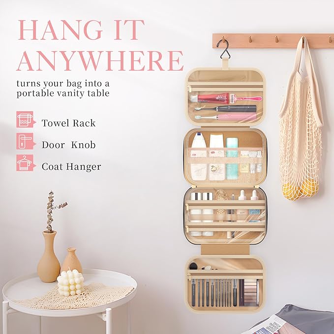 - STURDY HOOK DESIGN: Featuring a premium metal hook, the HOTOR cosmetic travel bag offers the convenience of hanging from a towel rack, coat hook, or any available space. This not only showcases your toiletries and cosmetics for easy accessibility but also saves valuable bathroom counter space. The sturdy metal hook is designed with a retractable feature, allowing it to be neatly stowed away when not in use.
