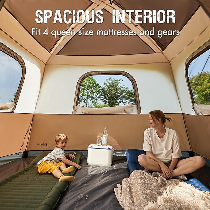 - Roomy Interior & 76" Tall: Measuring 10' x 9' x 76", this 6 person tent fits 2 queen size air mattresses or 6 sleeping bags. The 76" center height ensures enough space for standing and comfortable movement inside the tent.