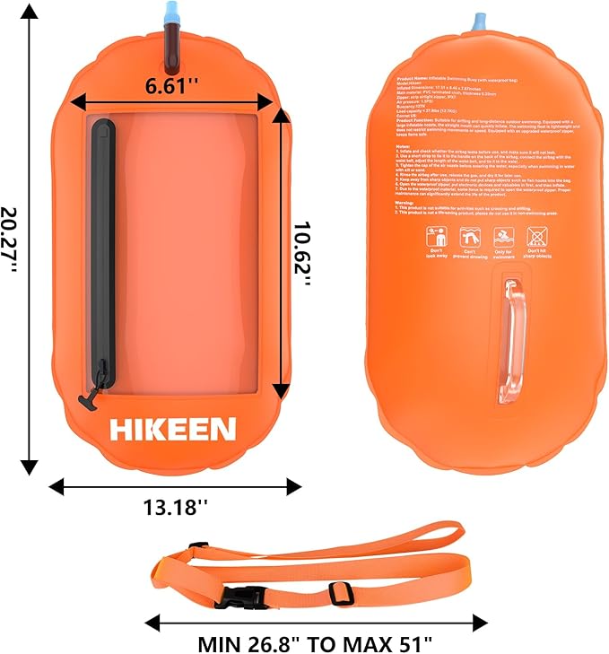- [High Visibility] Hikeen update swim buoy is bright orange with a fluorescent green belt, easily visible in open water to ensure your safety while swimming Suitable for Open Water Swimmers, Triathletes, Kayakers and Snorkelers .