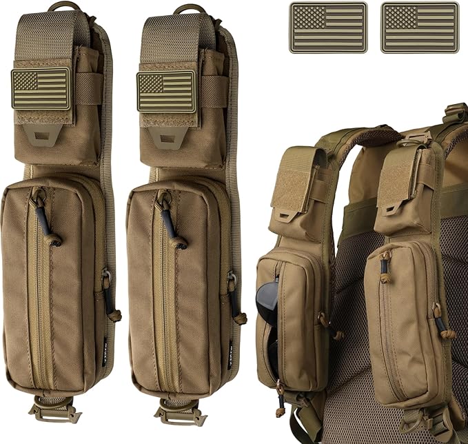 - 3 WAYS TO FIX ON: Molle accessories for backpacks has the same layout on back as our original version, which includes 2 x Molle straps and 2 x Hook-N-Loop straps to hold in place on the vertical/horizontal position. Strapping through the shoulder strap by the elastics, and firmly clipping the webbing with 2-way Z-Buckles. Wider adaptability for a most backpack.