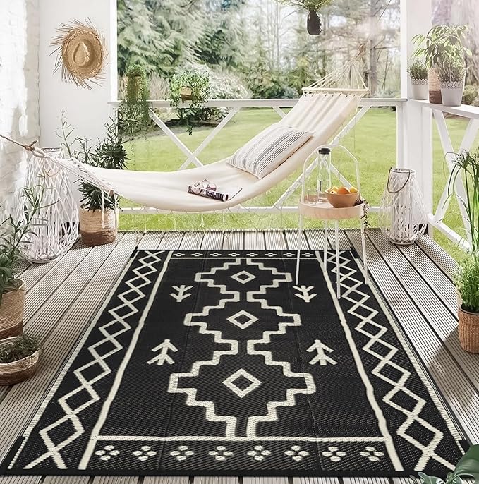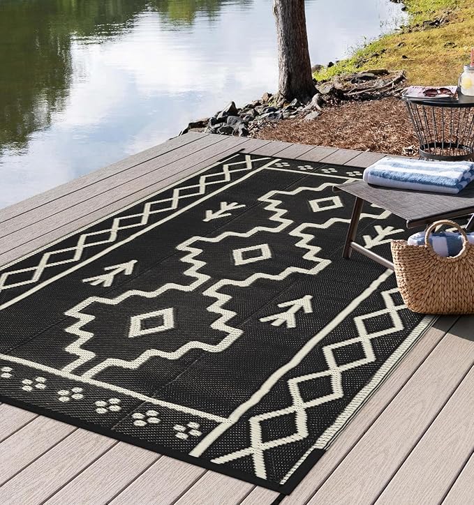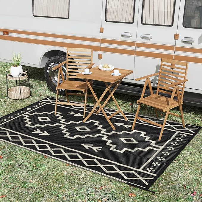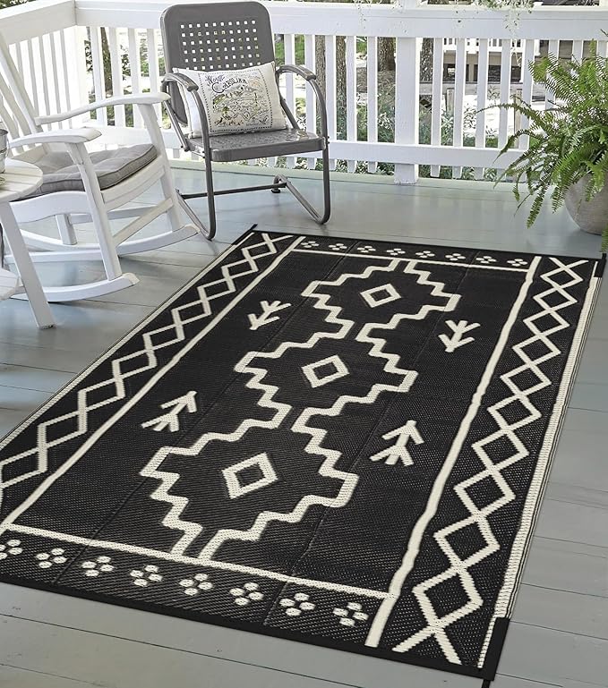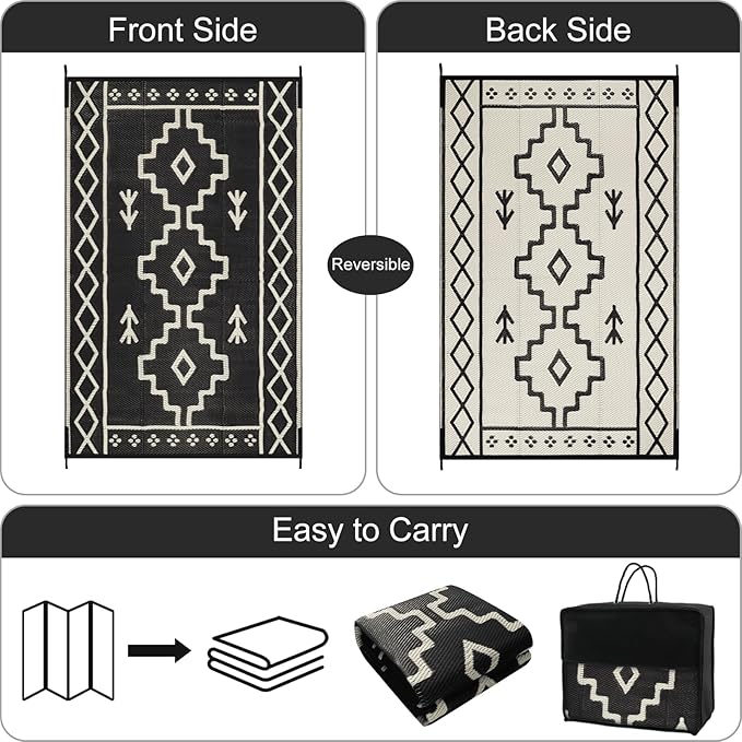 - [Reversible & Versatile] This outdoor camping rug is designed with two-sided geometric patterns, if one side is messed up, just flip over to get a new one, allows you to refresh your space in an instant. This boho outdoor carpet can be widely used in porch, patio, balcony, RV, deck, backyard, camper, balcony, picnic, tent.